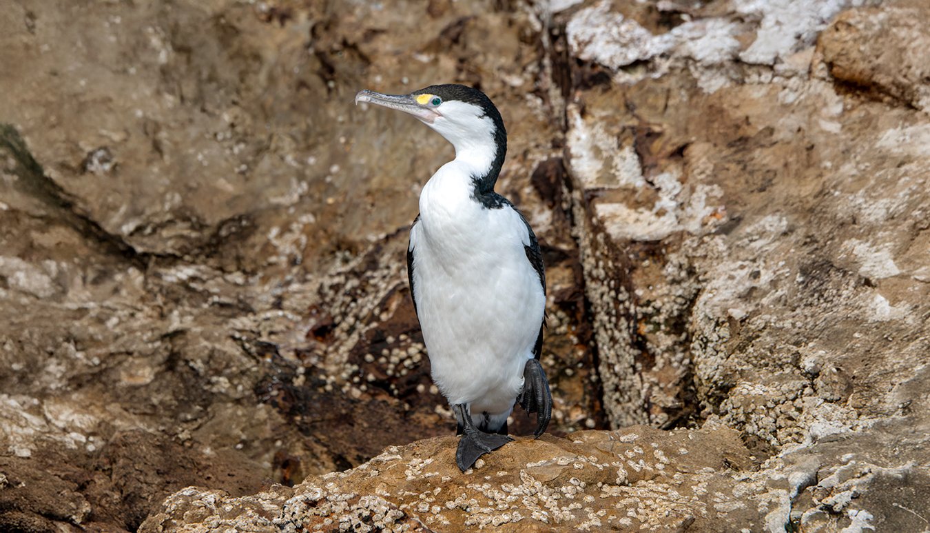 Pied Shags are large, striking shags with vivid blue eye-rings and yellow facial skin. We have a small colony nesting in the pōhutukawa trees around Tutukaka, so they are a familiar sight on tour — whether perched in the trees, flying overhead, or hunting in the harbour.